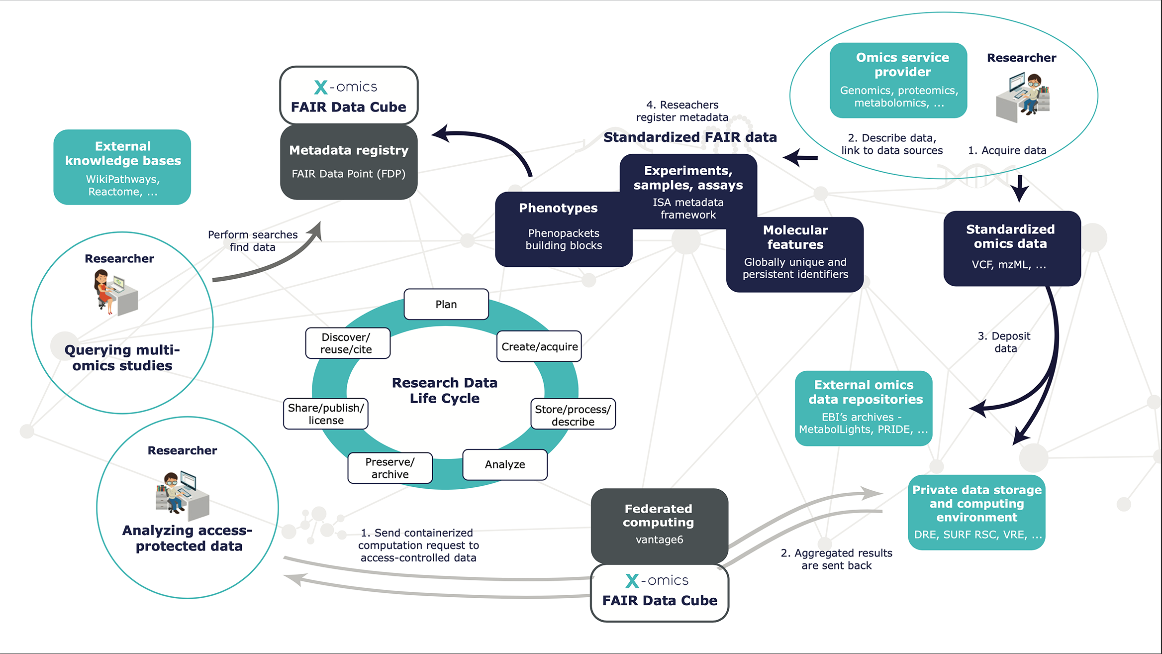 This is particularly true for researchers, who do not have access to state-of-the-art bioinformatics expertise, tools or analysis environments. The X-omics infrastructure will enable efficient data integration for data generated within X-omics and external datasets. X-omics adopts the FAIR principles and takes them a step further by helping researchers to: make data FAIR at the source, facilitate reuse of their data and make their data analysis workflows transparent and reproducible.