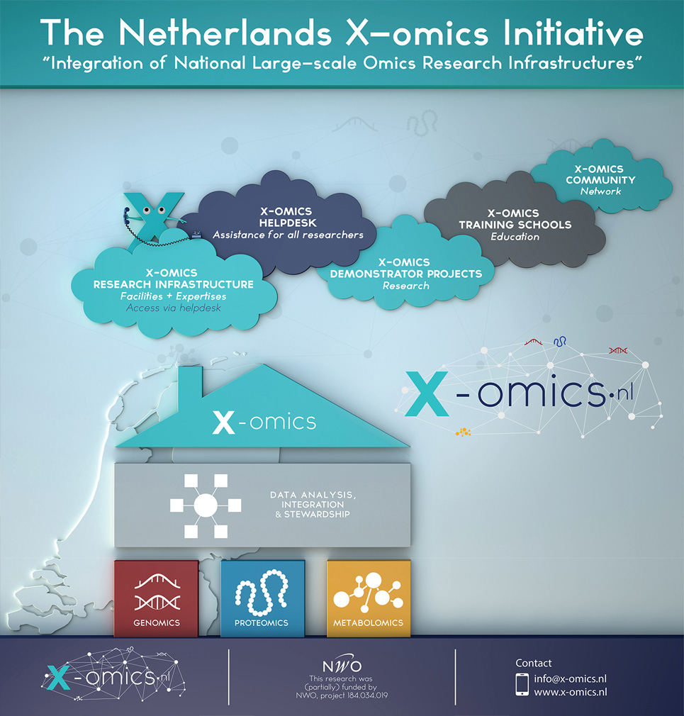 X-omics aims to establish a X-omics research infrastructure across the Netherlands, by combining technologies in the field of genomics, proteomics, metabolomics and data analysis, integration & stewardship. With this infrastructure biomedical problems can be solved using an integrated approach (analysis of samples using the available omics technologies of the infrastructure).